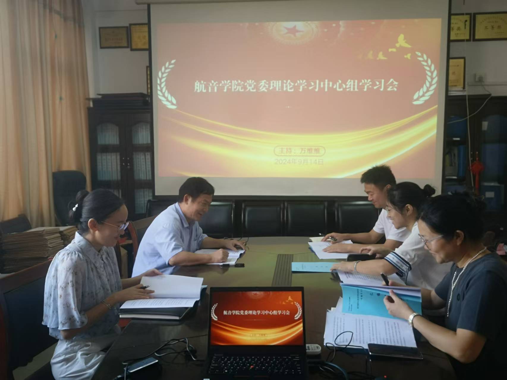 9月14日上午,航空服务与音乐学院在K208召开党委理论学习中心组学习会,深入学习党的二十届三中全会精神、巩固拓展党纪学习教育成果。学院党委书记万维维主持会议,学院党委理论学习中心组成员参加会议,艺术与设计学院党委副书记兼副院长余尚峰、组织员孙雅婷列席旁听。