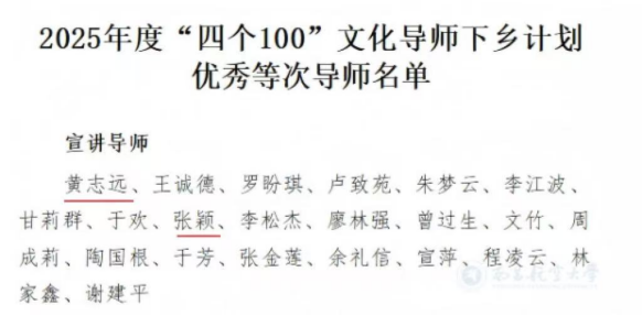 近日,中共江西省委宣传部发布《关于评定2025年度“四个100”文化导师下乡计划优秀等次导师和优秀项目的通报》,我院黄志远、张颖两名宣讲导师获评2025年度“四个100”文化导师下乡计划优秀等次导师。